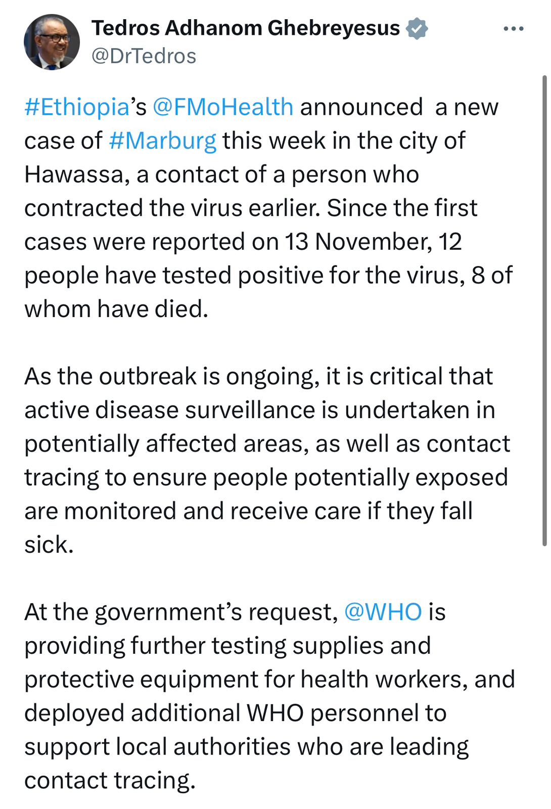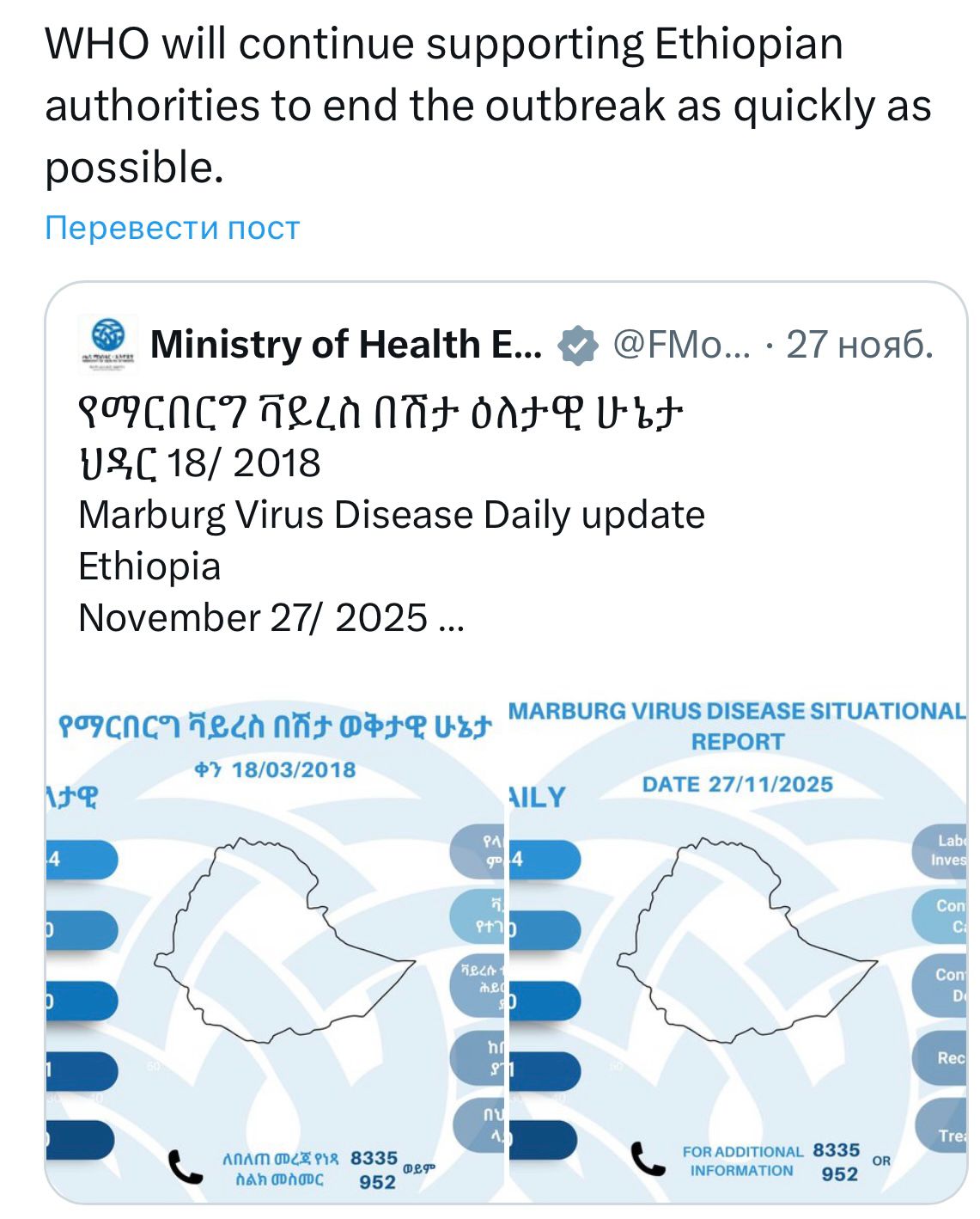 Глава Всемирной организации здравоохранения Тедрос Адханом Гебрейесус сообщил о вспышке вируса Марбург в городе Авас, который находится в центральной части Эфиопии.