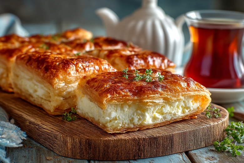В процессе выпечки слоеное тесто превращается в хрустящие, многослойные, золотистые пласты, а творожная начинка с яйцом и сахаром становится нежной, слегка влажной и тающей во рту.