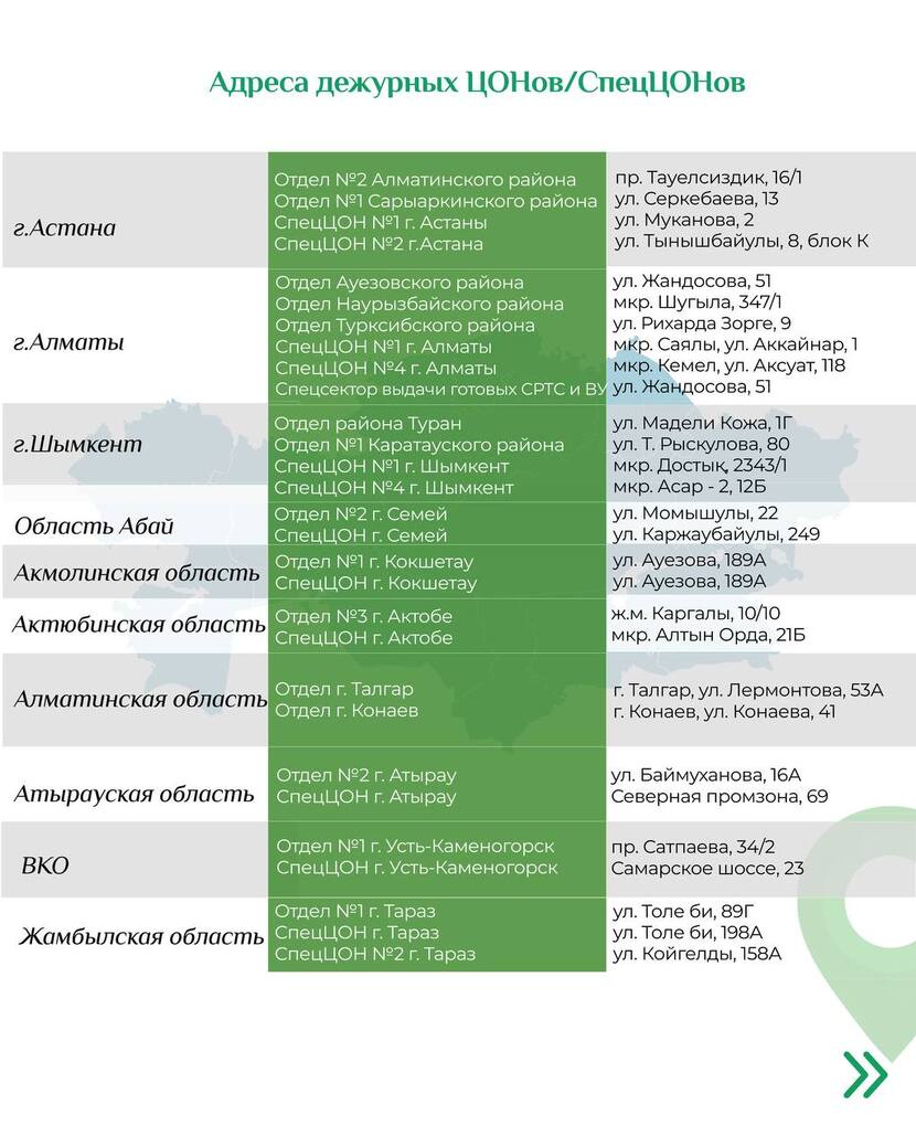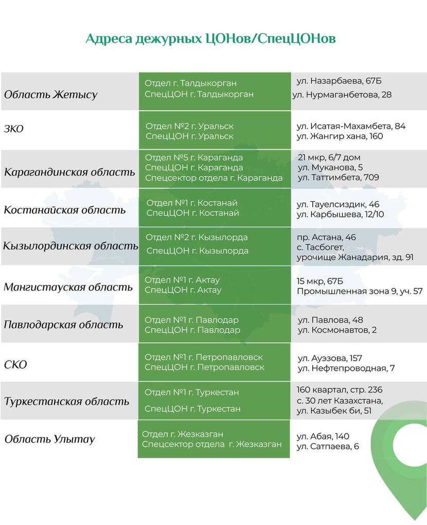 С 1 июля в городах Шымкент, Усть-Каменогорск, Тараз, Уральск, Караганда, Туркестан , а также в области Улытау меняются адреса дежурных ЦОНов, сообщает Total.kz.