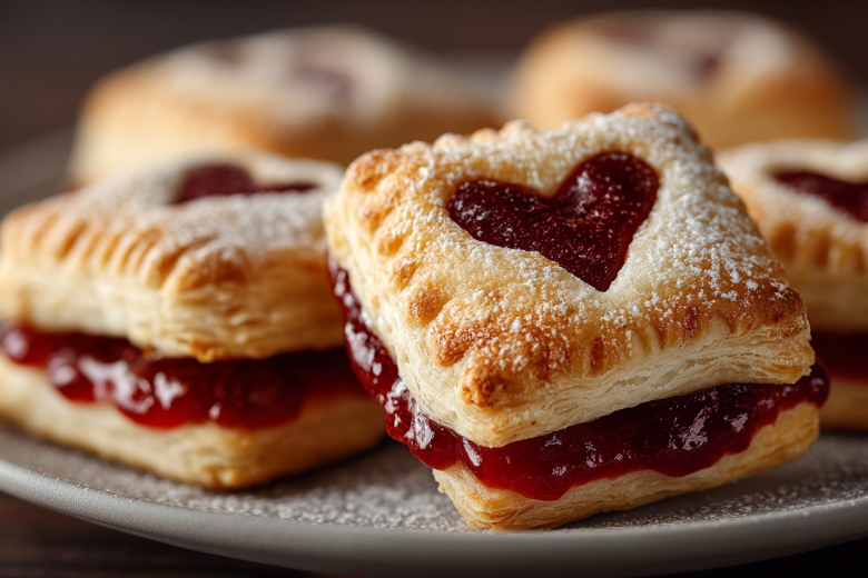 Разогрейте духовку до 200°C. Раскатайте тесто в пласт толщиной около 4-5 мм. Нарежьте его на одинаковые прямоугольники или квадраты. На половине прямоугольников с помощью формочки или ножа вырежьте в центре сердечко — это будут верхние части слоек. На целую часть заготовки положите чайную ложку джема. Смажьте края яичным белком или водой. Накройте сверху прямоугольником с вырезанным сердечком, аккуратно совместив края, и плотно защипните их вилкой. Смажьте верх слоек взбитым яйцом для блеска. Выложите слойки на противень с пергаментом. Выпекайте 15-20 минут до золотистого цвета.