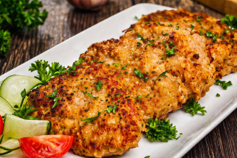 Получается обалденная вкуснятина: снаружи — хрустящая, ароматная корочка с лёгкой томатной ноткой, а внутри — мягкое и сочное мясо. За счёт сыра и зелени панировка выходит насыщенной и очень аппетитной, а кусочки получаются румяными и красивыми, как из хорошего ресторана.